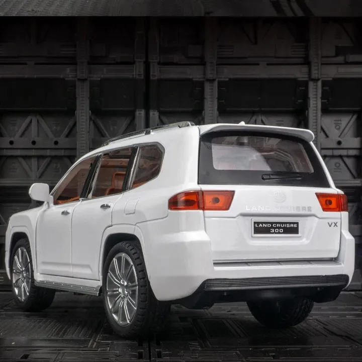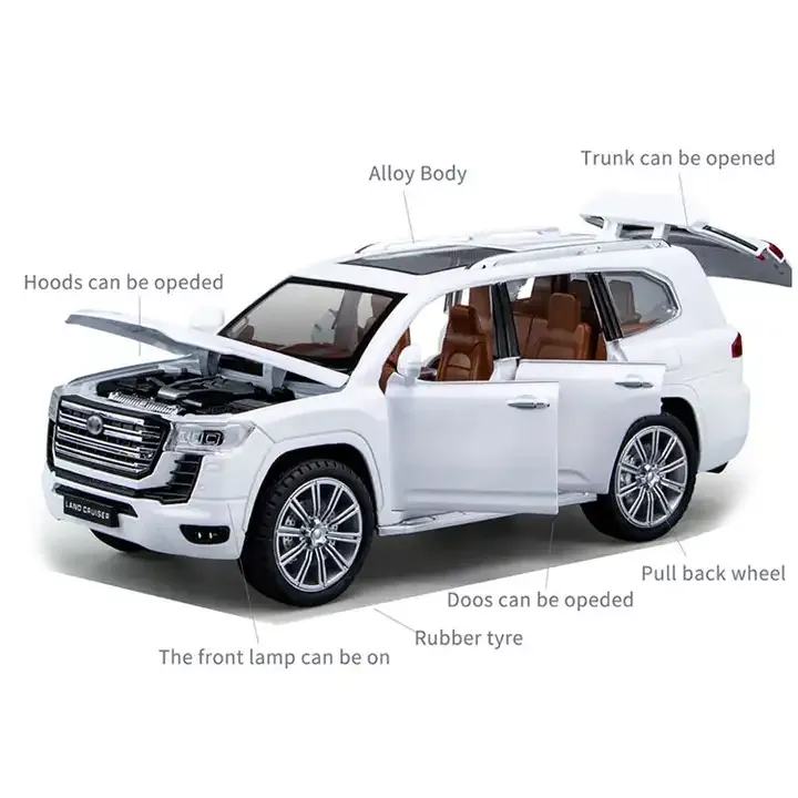 Toyota Land Cruiser V8 Die cast 1:24 Scale Model Car – Full Door Open wIth Hood and Tail Open – Pull Back action – Lights and Sound – Size Approx. 9 inch – White Faithfully replicates the Toyota Land Cruiser V8 with precise attention to detail, capturing the essence of the full-size vehicle. Perfectly scaled down to 1:24, providing a balance between size and intricate details for a visually appealing and realistic model. Enjoy the interactive experience with functional doors, hood, and tail, allowing you to explore the interior and engine compartment. The model car features a pull-back action mechanism, adding an element of playability. Simply pull it back and watch it zoom forward. Enhance the experience with functioning lights and sound effects, mimicking the real Land Cruiser. This feature adds an extra layer of realism and excitement. With a size of approximately 9 inches, the model strikes a balance between being large enough for intricate details and compact enough for display and play. The model is available in a classic combination of white and black, offering a timeless and sophisticated appearance. Crafted from high-quality diecast materials, ensuring durability and a premium feel. This model is built to last and withstand handling. Perfect for collectors, enthusiasts, or anyone who appreciates the Toyota Land Cruiser V8. The model’s attention to detail makes it a standout piece in any collection. Some models come with a display base, allowing you to showcase the Land Cruiser V8 model with pride.